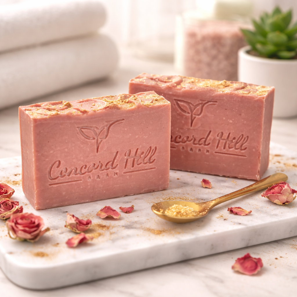 Concord Hill Farms handcrafted soaps are individually created and cut to 4.0 oz bars. Every bar is as unique as the person using it, so you many note slight variations in color and texture. All bars are cured for a minimum of 8 weeks before offered for sale. This helps insure that bars are completely saponified and hardened.